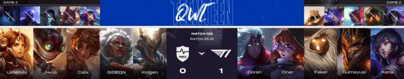 T1选用:Doran阿萝拉、Oner皇子、Faker阿狸、Gumayusi韦鲁斯、Keria巴德