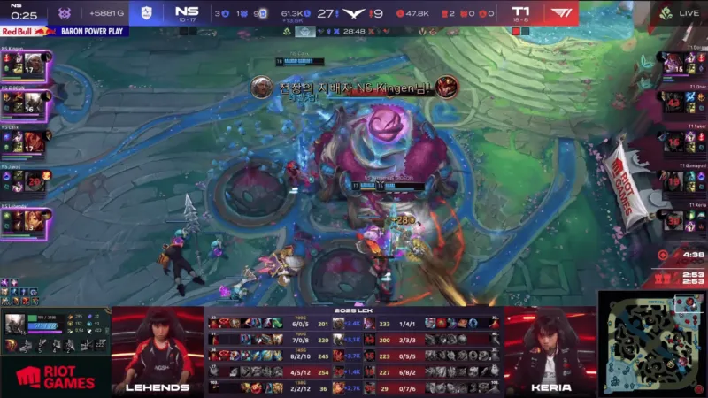 比赛第27分钟,下路团战NS击杀T1双C,随后NS一波结束比赛。